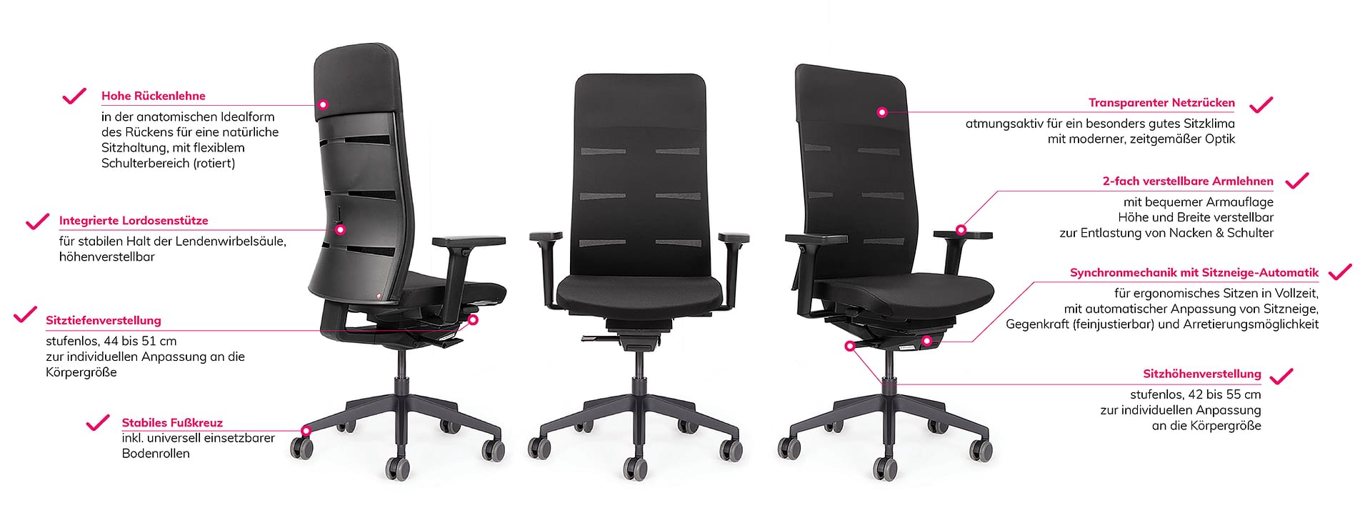 AutoActive Syncromatik: integrierte Synchronmechanik (Sitz und Rücken bewegen sich im Verhältnis 1:3), mit Sitzautomatik: automatische Gewichts-/Federkrafteinstellung, fein justierbar, Rückenlehne in vorderster Sitzposition (0°) arretierbar, Wegbegrenzung möglich, frei bewegliche Sitzneige nach vorn, stufenlos, gedämpft