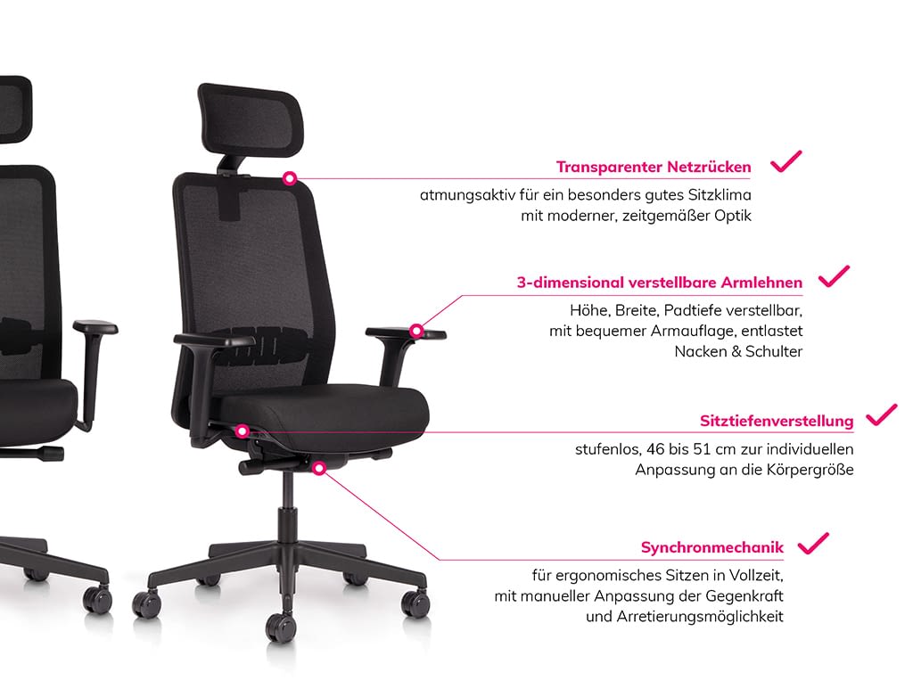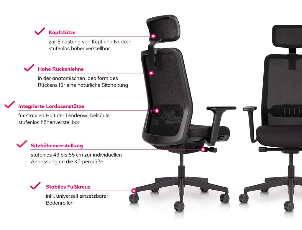 Der bequeme Netzrückenstuhl für das Büro oder Homeoffice ist nicht nur unschlagbar günstig, er bringt auch alles mit, was man von einem ergonomischen Bürostuhl erwarten kann: Komfort-Sitzfläche und atmungsaktive Netzrückenlehne, Kopfstütze, Lodosenstütze und Armlehnen, dynamisches Sitzen mit hochwertiger Synchronmechanik und vielfältige Verstellmöglichkeiten zur individuellen Anpassung. Dazu hochwertige Materialien, Langlebigkeit – und ein besonders attraktiver Preis.
